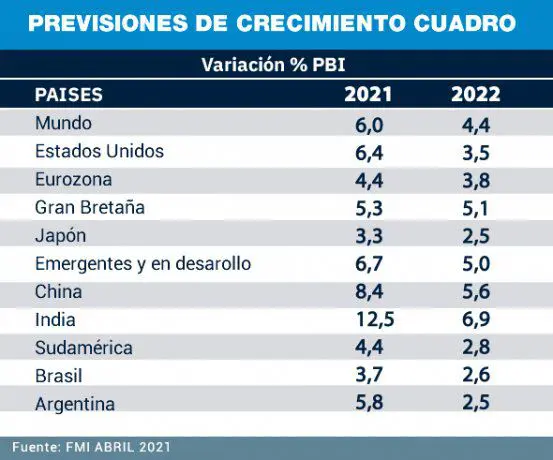 Para el año 2022, el Fondo espera una moderación en el crecimiento: prevé un avance de 2,5%. Dado que la economía argentina tuvo un fuerte retroceso de 9,9% en 2020, de cumplirse las previsiones del organismo multilateral de todas formas el año próximo el PIB sería 1,4% inferior al nivel alcanzado en 2019.